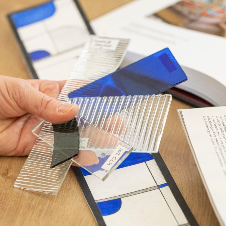 (Ici échantillons de verre pour une verrière vitrail réalisée par l'Atelier de Vaness)